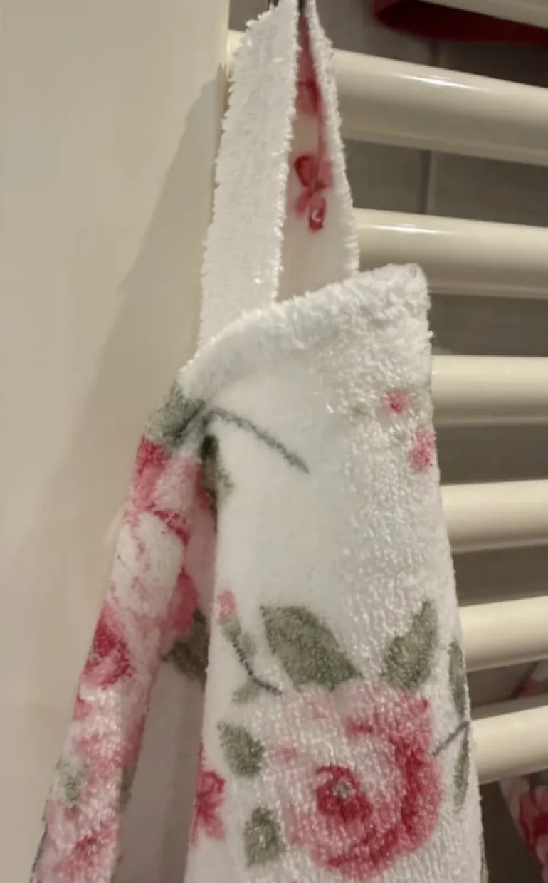 •voorzien van een royale ophanglus in dezelfde stof als de handdoek