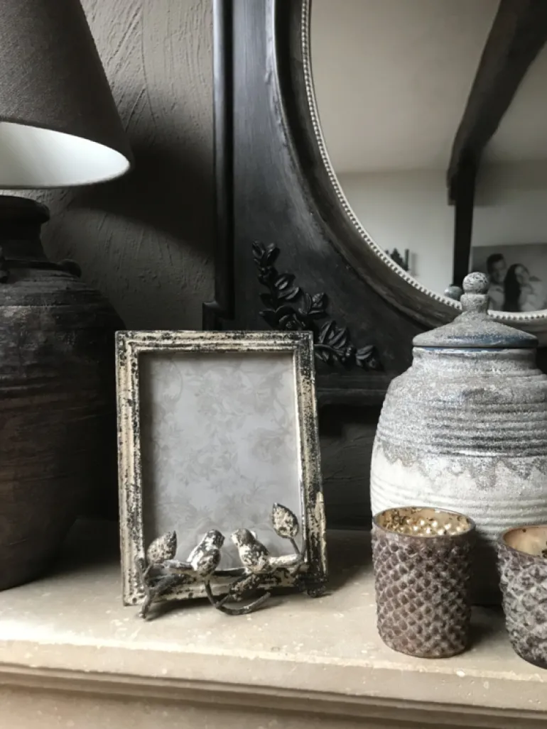 Prachtige fotolijst voor je mooiste foto! De fotolijst is oud gemaakt en heeft daardoor een brocante uitstraling. Aan de onderkant vind je 2 ijzeren vogeltjes en takjes met blaadjes.