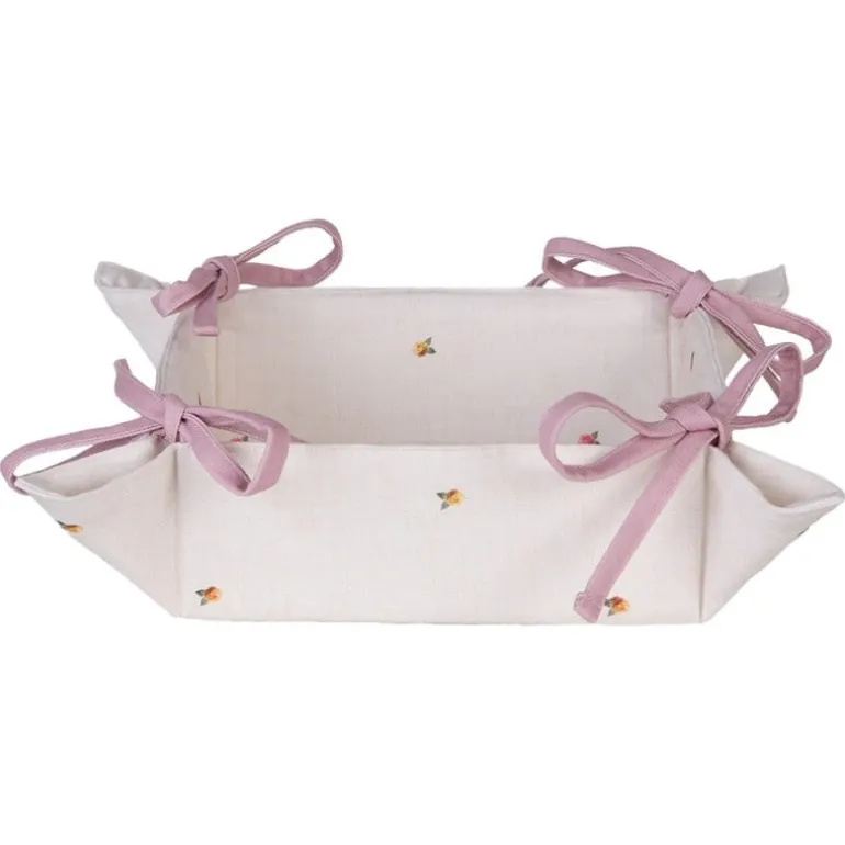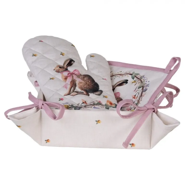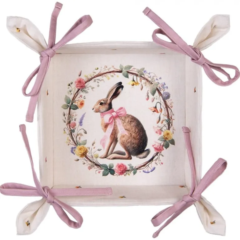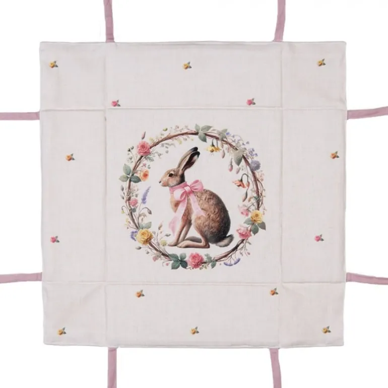 De textielserie is gemaakt van katoenen stof met eenbeige ondergrond en een design van een mooie krans met daarin een haas met een rozestrik. De krans heeft allemaal bloemetjes, roosjes en blaadjes. Verspreid over de stof vind je ook kleine roosjes en blaadjes. De meeste items van deze serie zijn afgewerkt met een rozeband.