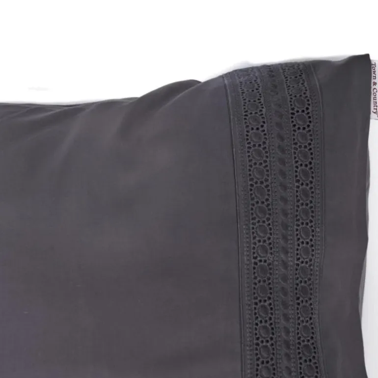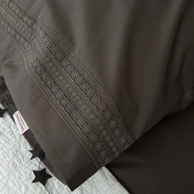 40 cm vanaf de bovenzijde vind je een baan met mooiebroderie, de achterkant is glad percal katoen. De slopenhebbendezelfde broderie strook aan de zijkant.