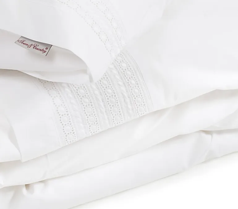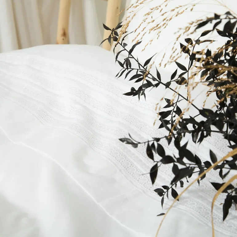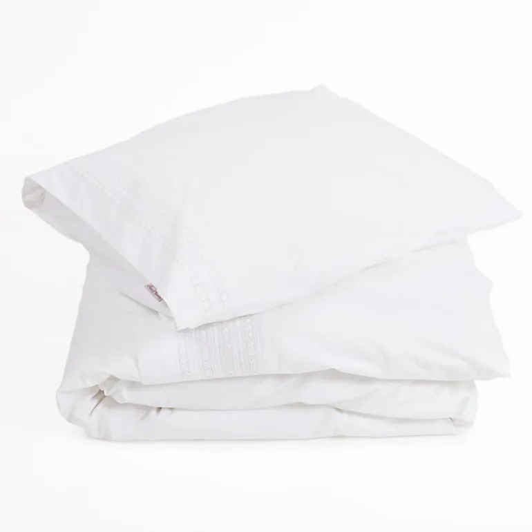 40 cm vanaf de bovenzijde vind je een baan met mooie broderie, de achterkant is glad percal katoen. De sloop heeft dezelfde broderie strook aan de zijkant.