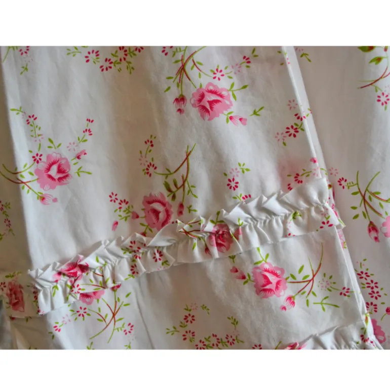 Prachtige romantische pyjama met roosjes, Het jasje heeft gestoffeerde knopen,een zakje op de linkerborst en aan de zijkanten splitjes. De broek is voorzien van elastiek in de band en een extra aantreklint,onder aan de pijpen zitten twee ruches. Er is een reserveknoopje bijgevoegd.