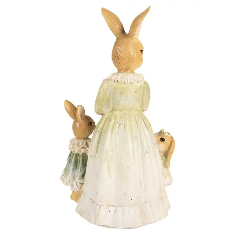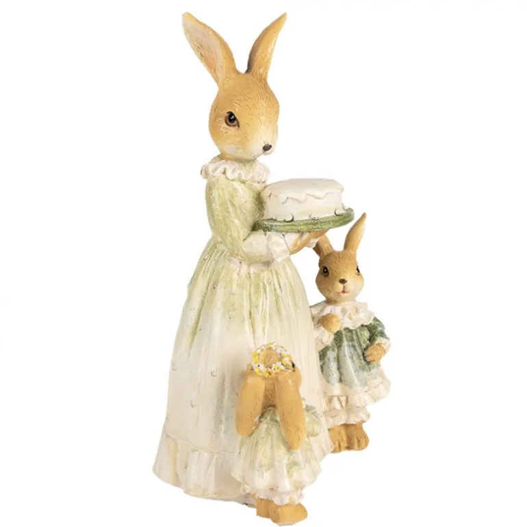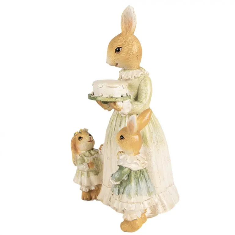 Een prachtige decoratie dit beeld van een konijnen moeder met een taart en 2 konijnen kindjes. Ze hebben prachtige feestelijke kleding aan zouden ze een feestje hebben?
