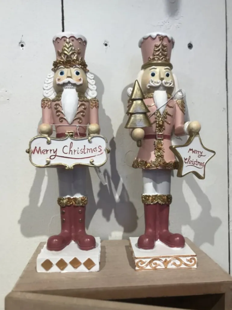 Prachtige decoratie van een notenkraker in diverse roze – en goud tinten en een bordje met de tekst Merry Christmas!