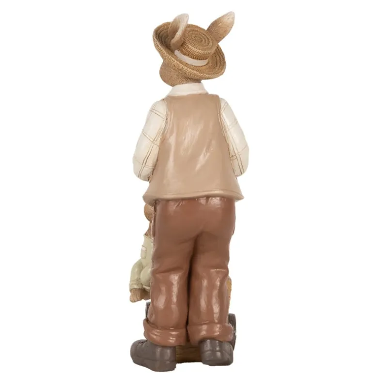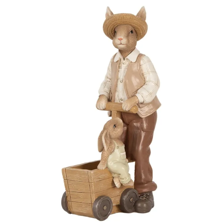 Een schattige decoratie deze vader konijn met hoedje en gilet staand bij een ‘houten’ kar met daarop een klein jongens konijntje.In de kar kan eventueel nog een klein plantjeingezet worden of vullen met paaseitjes.