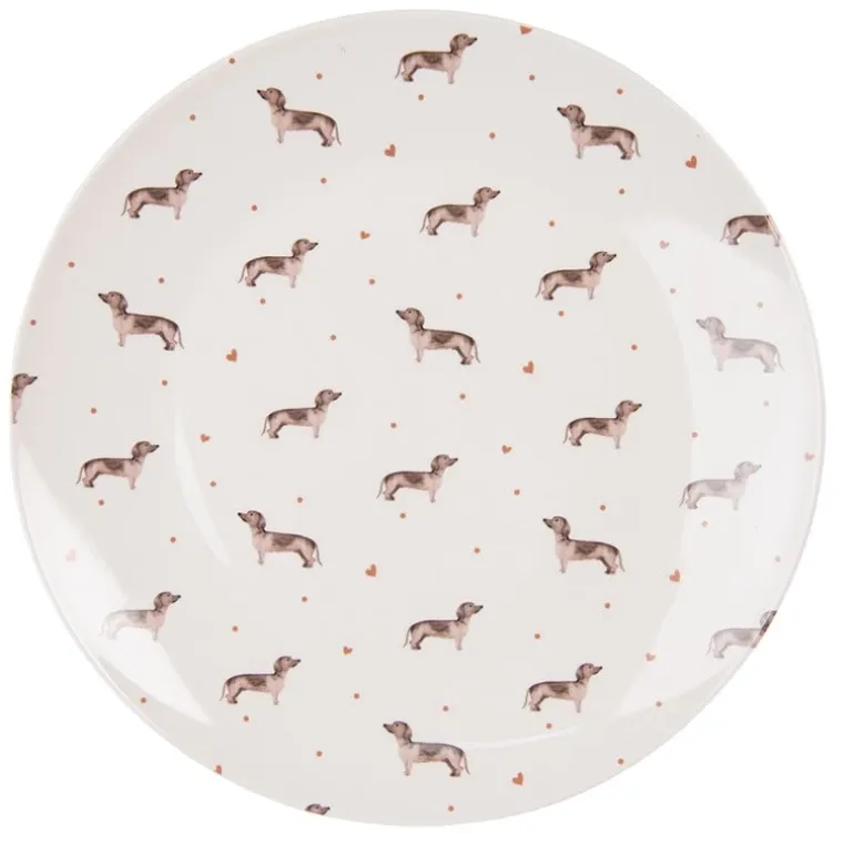 Het dinerbord heeft een print van teckels enkleine hartjes.