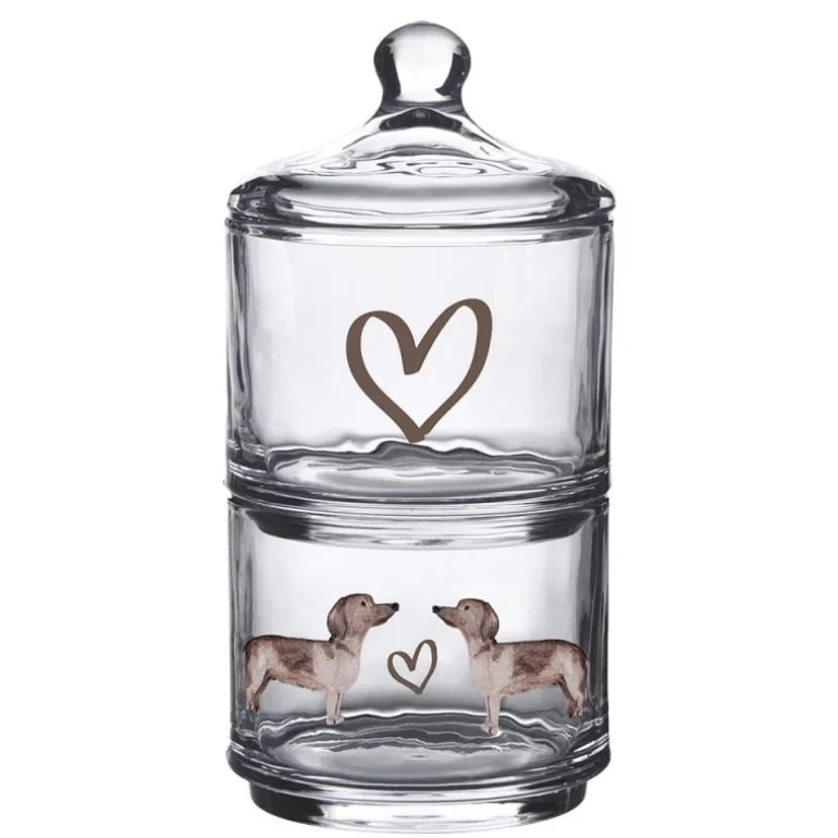 Leuke dubbele ronde glazen voorraad of bewaarpot met deksel in een romantische stijl. De opdruk is een hart en op de onderste pot 2 teckels met er tussenin een hartje.