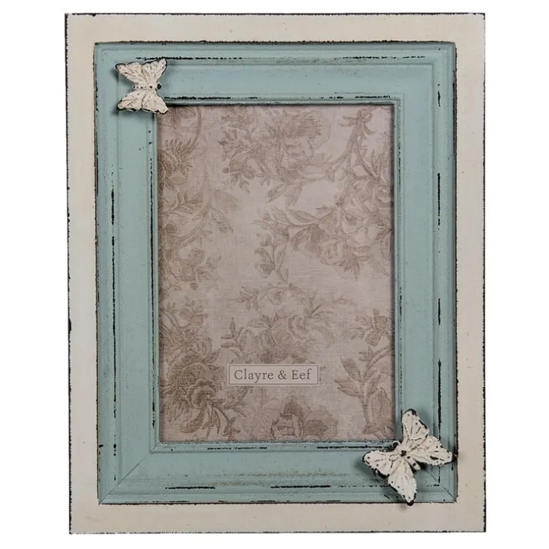 Mooie landelijk romantischefotolijst met op 2 hoeken een vlinder. De fotolijst is oud gemaakt en heeft daardoor een brocante uitstraling.