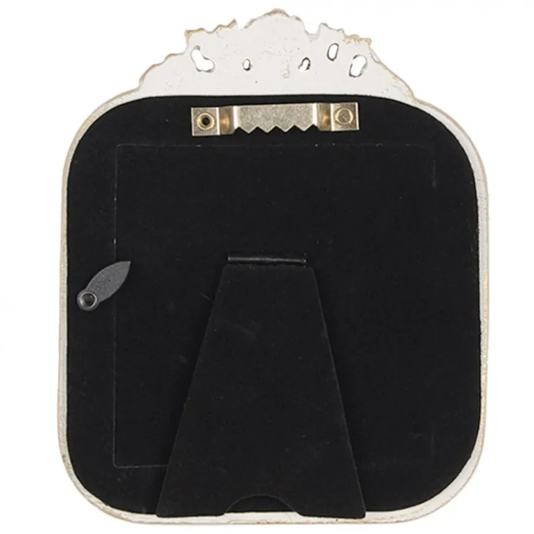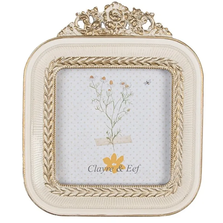 Mooi vierkant fotolijstje en zeer geschikt voor de kleinere foto’s. Het fotolijstje heeft een beige kleur en is afgewerkt met een mat gouden tint. Aan de bovenkant vind je een mooi ornament enrondom het glas bevinden zich kleine blaadjes.