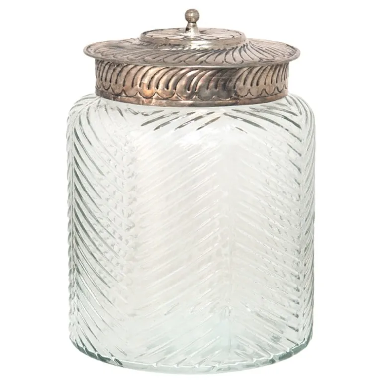 Mooie glazen voorraadpot met een leuk motiefje en een oudzilverkleurige deksel.