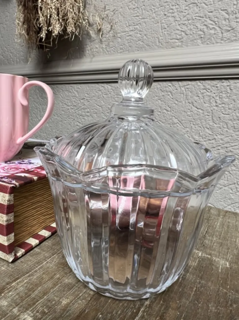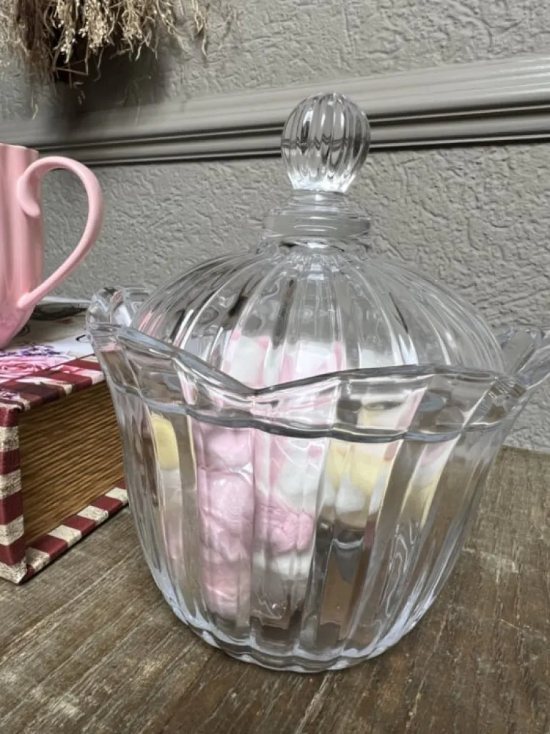 Zeer geschikt om er bonbons, pepermuntjes, chocolaatjes of andere lekkernijen in te bewaren en het staat ook nog eens decoratief op tafel of kastje.