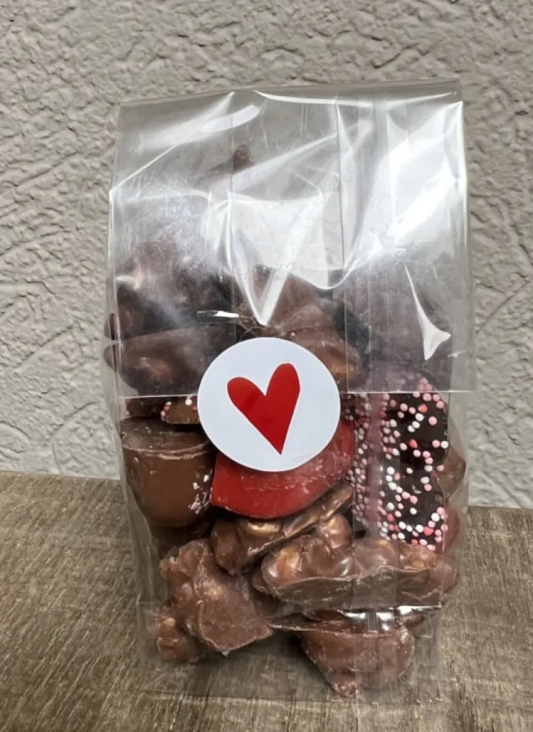 •chocolade is assortie met hartjes in diverse soorten en pindarotsjes