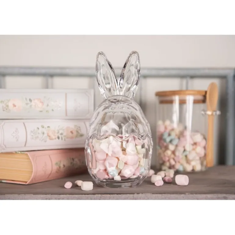 Prachtig transparant glazen potje in de vorm van een ei met konijnenoren in een landelijke stijl.