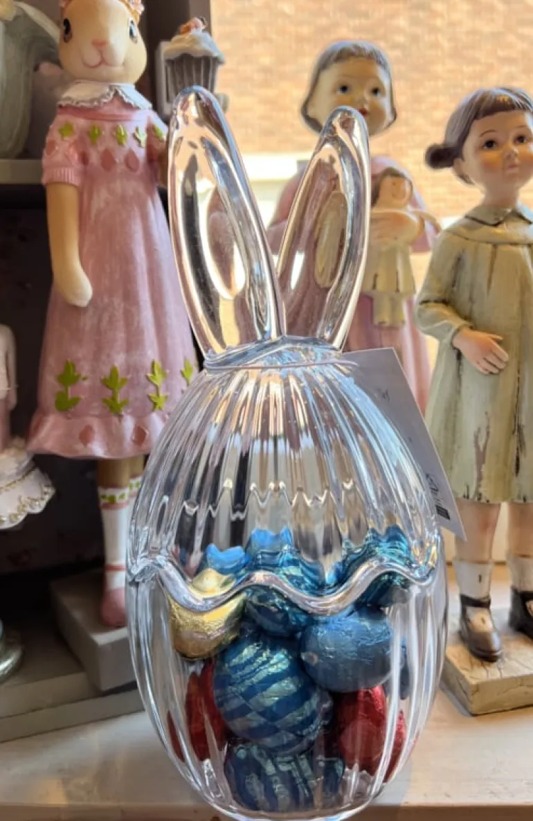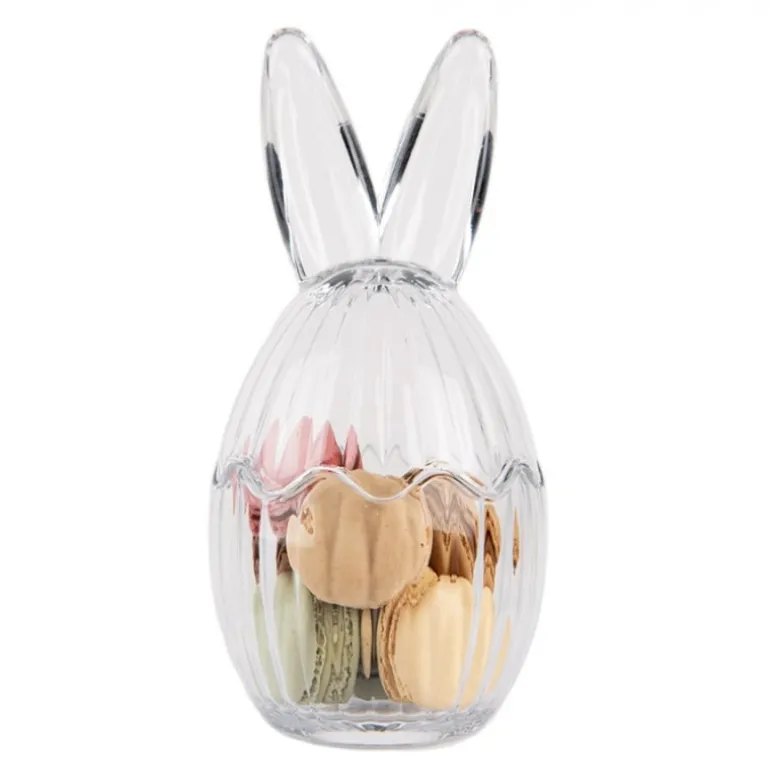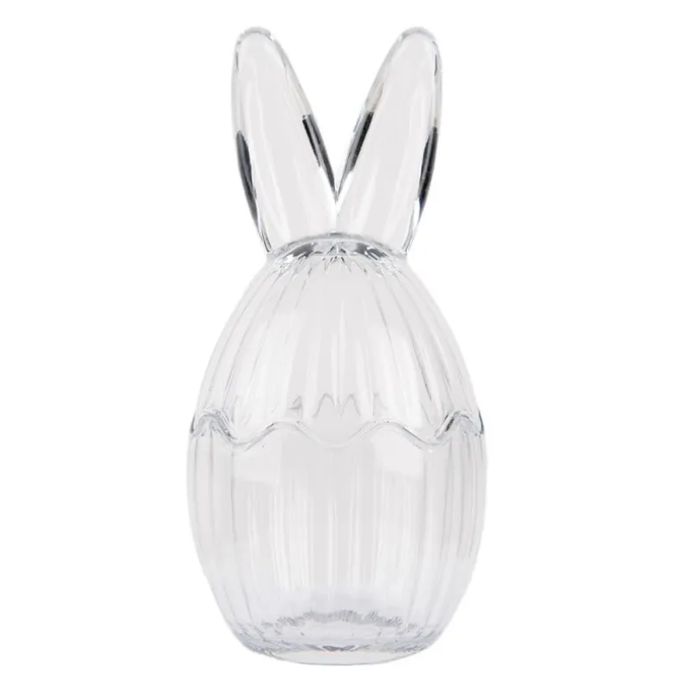 Prachtige glazen pot of bonbonièrein de vorm van een ei met konijnenoren!