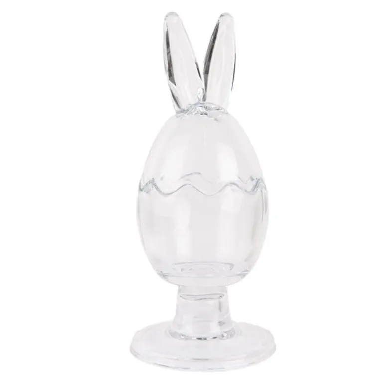 Prachtige glazen pot op voet in de vorm van een ei met konijnenoren.