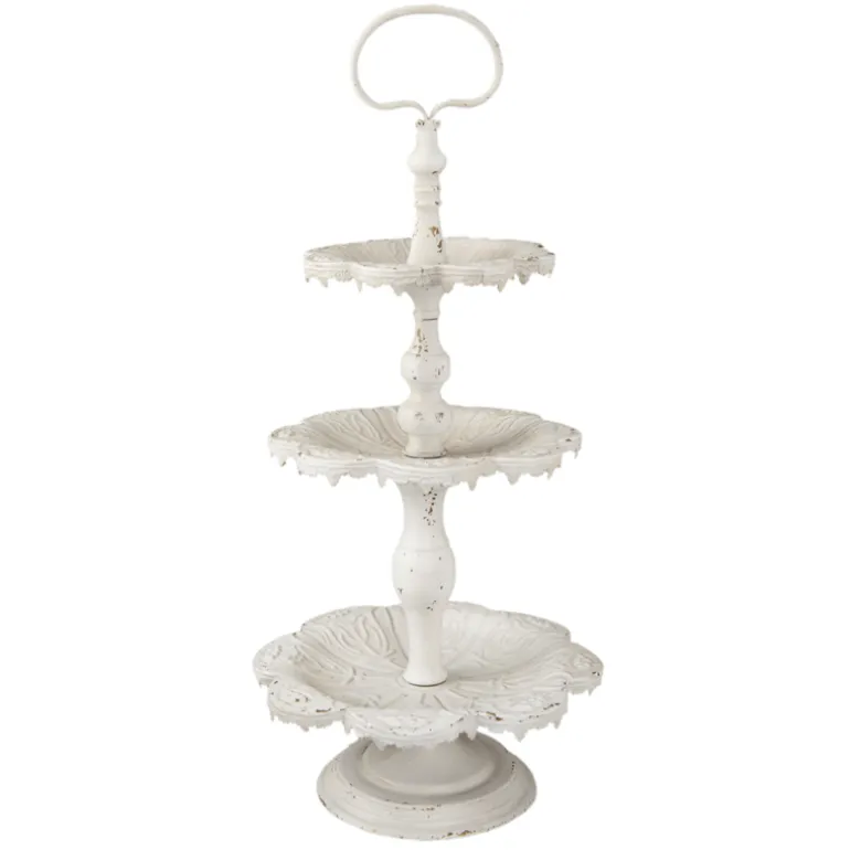 Prachtige hoge smalleetagere met 3lagen, de randen hebben geschulpte randen en doen denken aan een bloem, de randen zijn mooi afgewerkt het lijkt wel een kantje!Aan de bovenkant bevind zich een grote ringwaarmee de etagere gemakkelijk verplaatst kan worden. De etagere staat op een stevige voet.