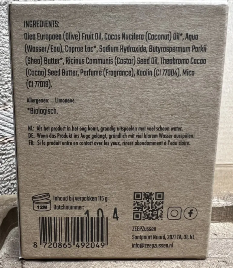 →De zeep wordt geleverd in een mooi kraftdoosje welke bedrukt is met biologisch afbreekbare inkt.