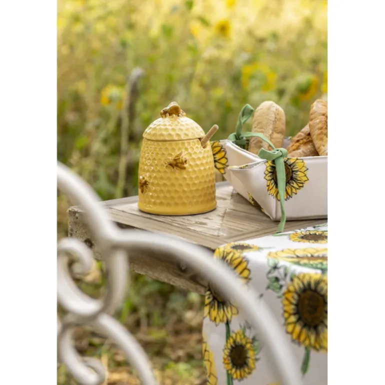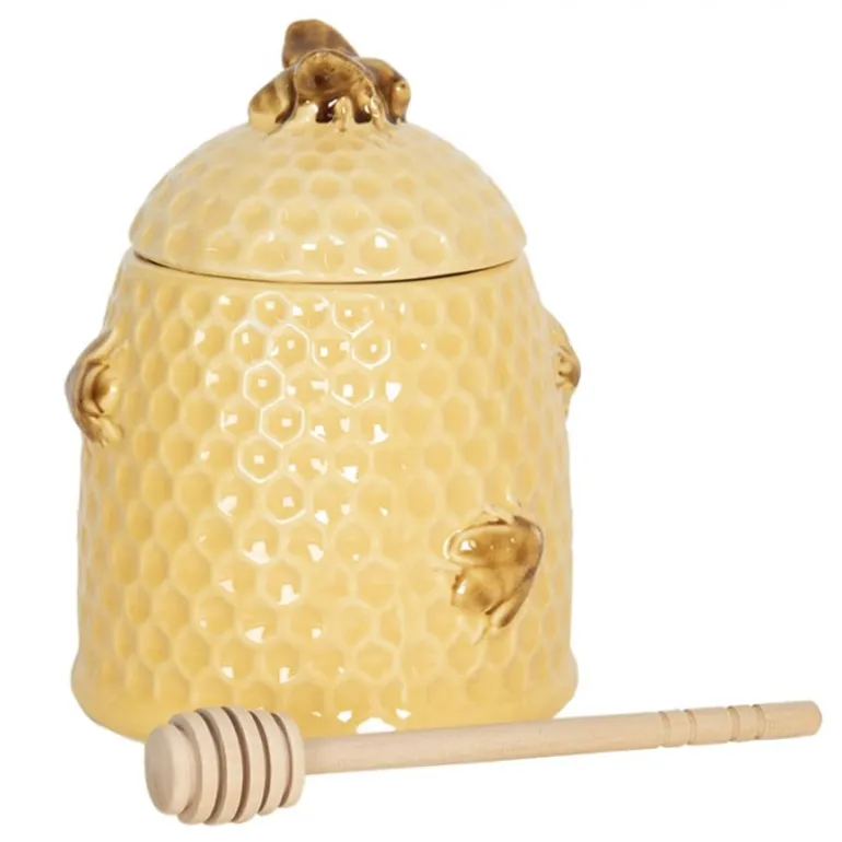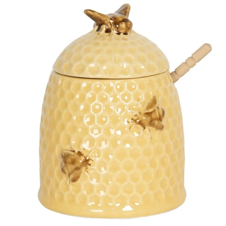 Mooie gele keramieken honingpot met bruine bijtjes. De honingpot in landelijke stijl is voorzien van een deksel en een houten honinglepel.