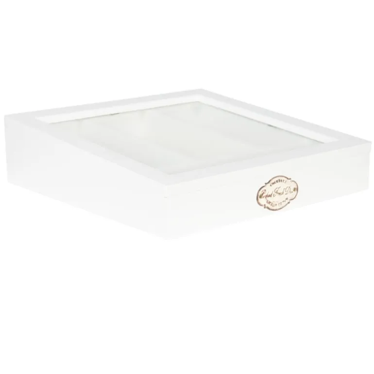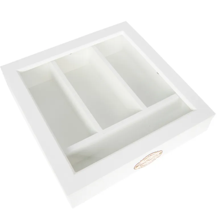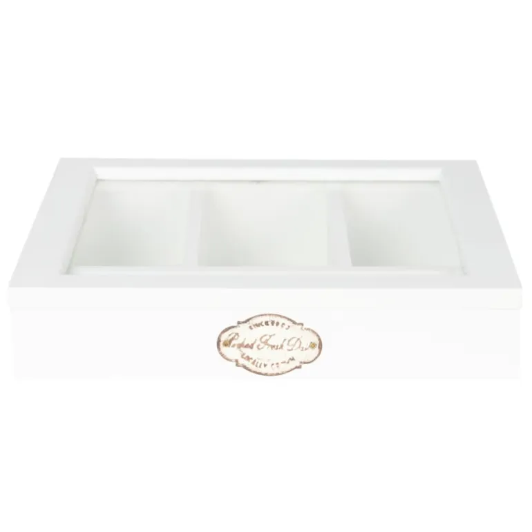 Leuke houten bestekbakmet 4 vakken en aan de voorkant een stoerbrocant plaatje met tekst. De bestekbak is voorzien vaneen glazen deksel.