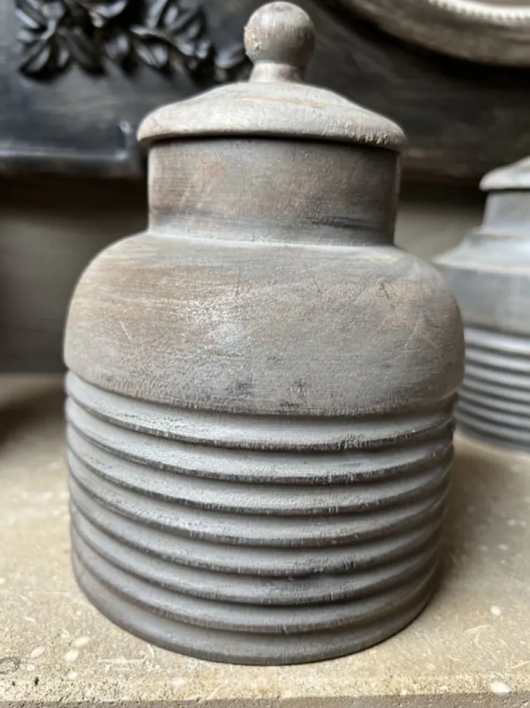 Prachtige houten decoratie pot voor in een stoer landelijk interieur. De decoratie potheeft een afneembaar deksel is puur voor decoratie en niet geschikt om etenswaren in te bewaren.
