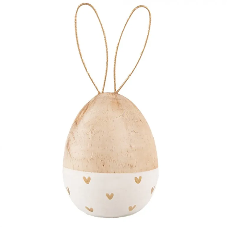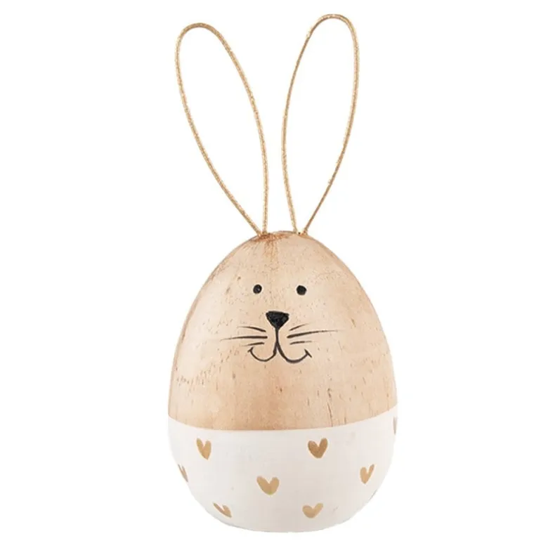 Schattig houten konijn in de vorm van een ei! Het konijn heeft metalen oren en een witte rand met goudkleurige hartjes!