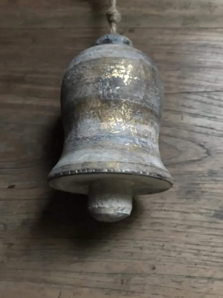 Prachtige houten hanger in de vorm van een bel, oud gemaakt en met een vleugje goudkleur
