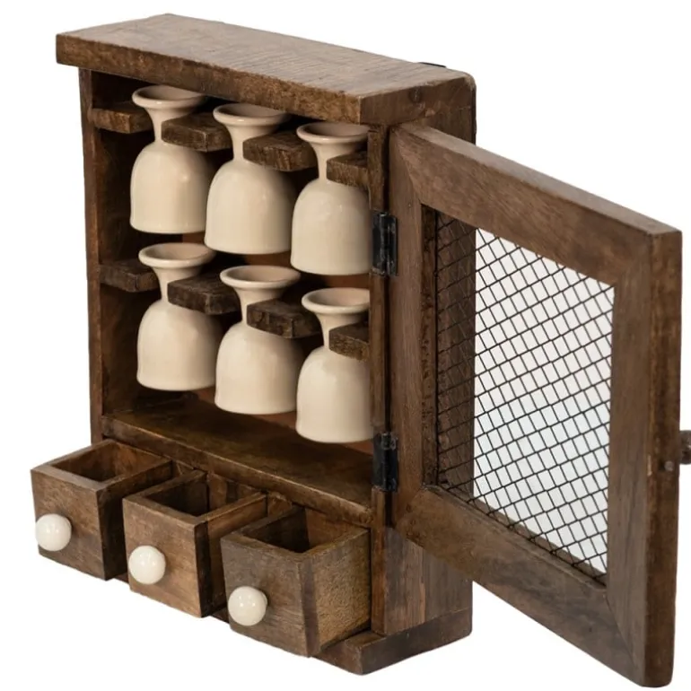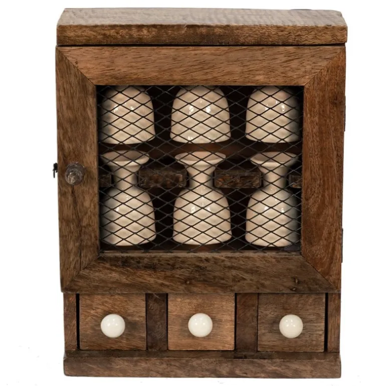 Super leuk voor in de landelijke keuken dit houtenkastje met 6 keramieken eierdopjes!