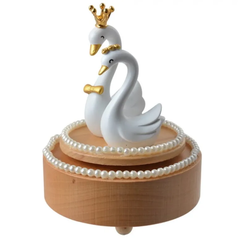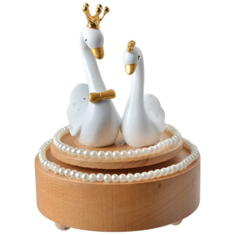 Een mooie houten muziekdoos met een rustgevend muziekje. De muziekdoos is in houtkleur en is voorzien van 2 schattige zwanen met goudkleurige details. Op der and bevinden zich kleine pareltjes. Je zet de muziekdoos aan door aan het bovenste gedeelte te draaien.