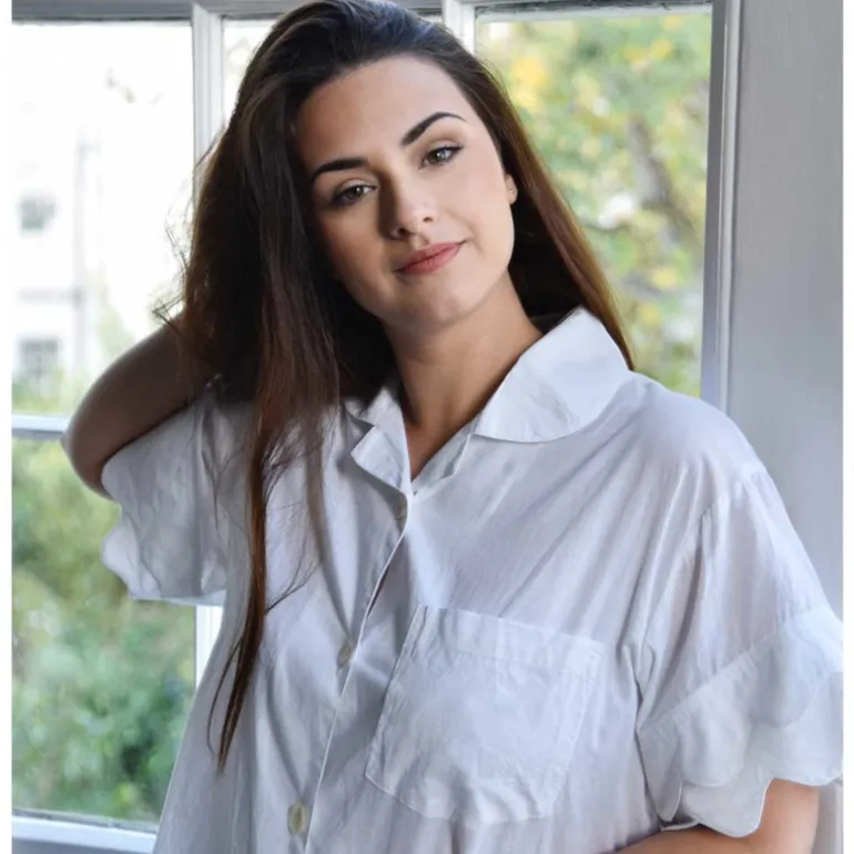 Prachtige witte katoenen pyjama met een korte broek. De mouwen van de top en de pijpen van de korte broek hebben een dubbele geschulpte rand. De top heeft een kraag, een zak op de linker borst en gestoffeerde knopen.