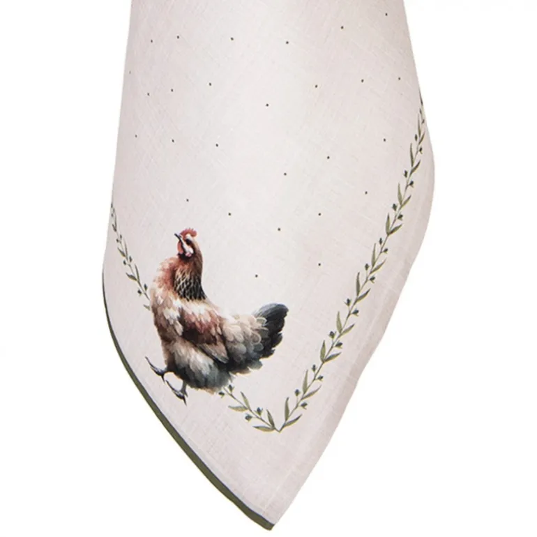 De textielserie Barnyard Chicken van Clayre & Eef is gemaakt van een mooie katoenen stof met beige ondergrond en met een print van heuse boerderij kippen! Ook vind je er een versiering van kleine blaadjes en groene stipjes. Het geheel is afgewerkt met een groene band. Kortom een gezellige serie voor een landelijk interieur!