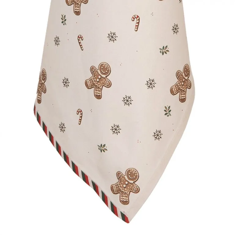 De mooie beige katoenen stof heeft een leuke print van peperkoek mannetjes, zuurstokjes en sneeuwvlokjes. De artikelen zijn afgewerkt met een streepjesstof in de kleuren beige, rood en groen.