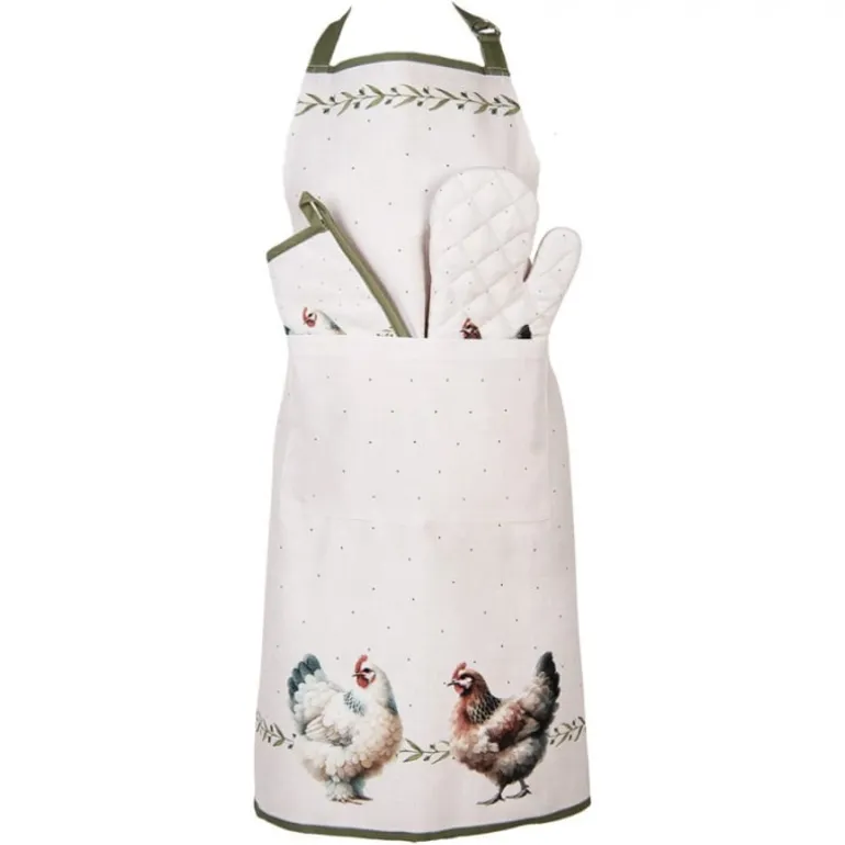 De textielserie Barnyard Chicken van Clayre & Eef is gemaakt van een mooie katoenen stof met beige ondergrond en met een print van heuse boerderij kippen! Ook vind je er een versiering van kleine blaadjes en groene stipjes. Het geheel is afgewerkt met een groene band. Kortom een gezellige serie voor een landelijk interieur!