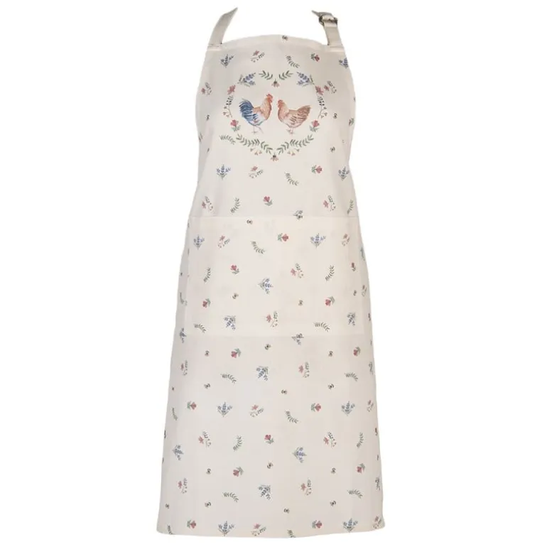 De beige katoenen stof van deze keukenschortheeft een gezelligeprint van kleine bloemetjes en een kip en haan. Super leuke textielserie voorin de landelijke keuken of eetkamer!