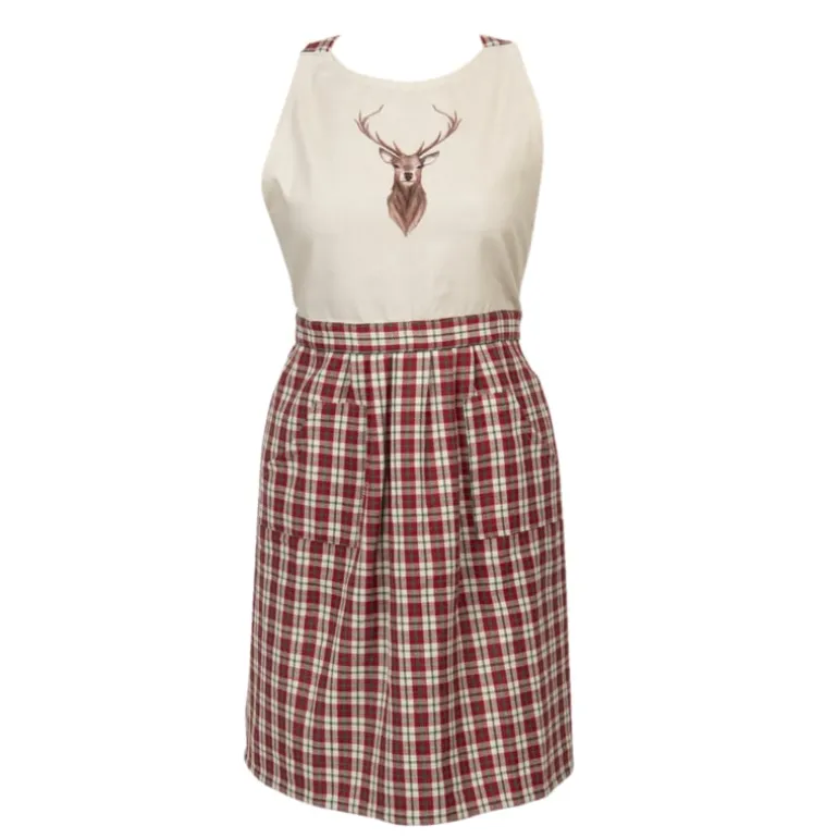 Een effen beige stof met een print van een rendier met gewei en een landelijke geruite stof. Sommige artikelen van deze serie zijn afgewerkt met een mooie band, ook met een print vaneen rendier met gewei.