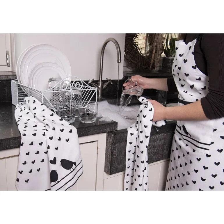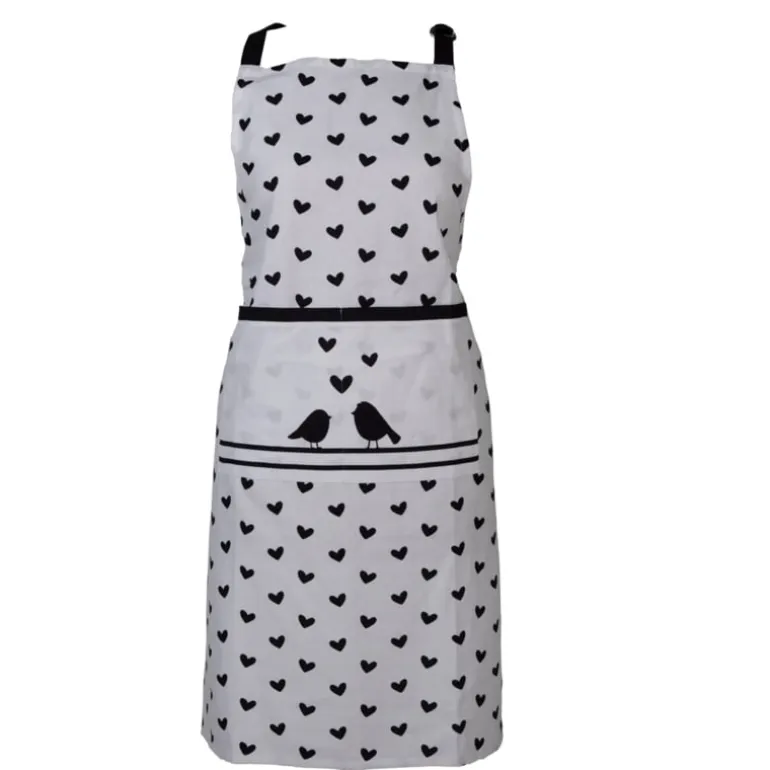 Deze leuke keukenschort in een landelijk romantische stijl isgemaakt van een witte katoenen stof bedrukt met zwarte hartjes en vogeltjes. Deze stijl past in elk keukeninterieur!