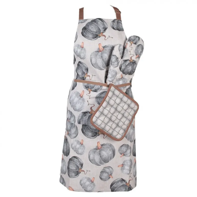 De leuke serie Country Style Pumpkin van Clayre en Eef heeft een prachtig pompoen design in een grijze met beigetint. Sommige artikelen van deze serie hebben een combinatie van pompoenen met een mooie grijze geruite katoenen stof. Als afwerking is een bruine biais band gebruikt. Fleur je keuken op met deze leuke serie!
