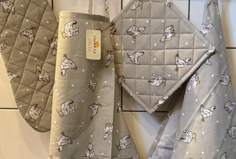 Super leuke complete set keukentextiel met een mooie kippen print en witte stippen op een beige achtergrond.