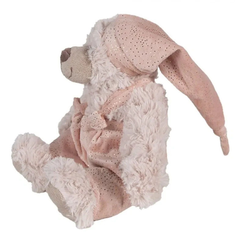 Schattige lichtroze knuffelbeer! De beer heeft een roze kostuum aan en een slaapmuts op. Op de kleding van de beer zitten kleine goudkleurige stipjes!