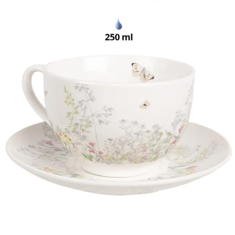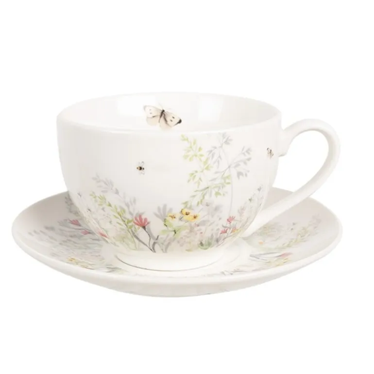 Deze mooie kop en schotelmet bloemenmotiefvan de serieWildflowerFieldsvan Clayre & Eef is als een heerlijk frisse lentebriesdie door de lichte kleuren, vrolijke bloemen en witte achtergrond voor vele zonnige en gezelligemomenten aan tafel zal zorgen. Maak het compleet met de bijpassendetextielserieen voeg daardoor een unieke sfeer toe aan de maaltijden.
