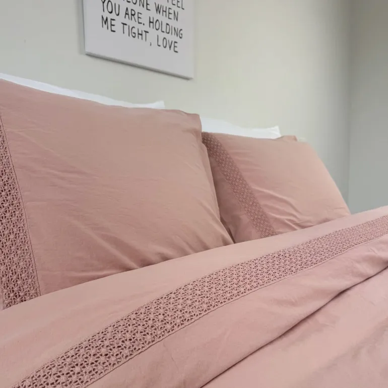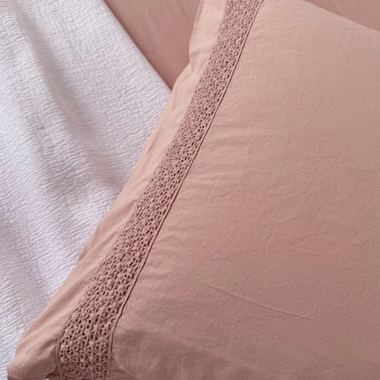 Voor een verfijnde uitstraling is er een elegante gehaakte rand aangebracht die 40 cm vanaf de bovenzijde over de volle breedte loopt en subtiel terugkomt aan de zijkanten van de slopen.