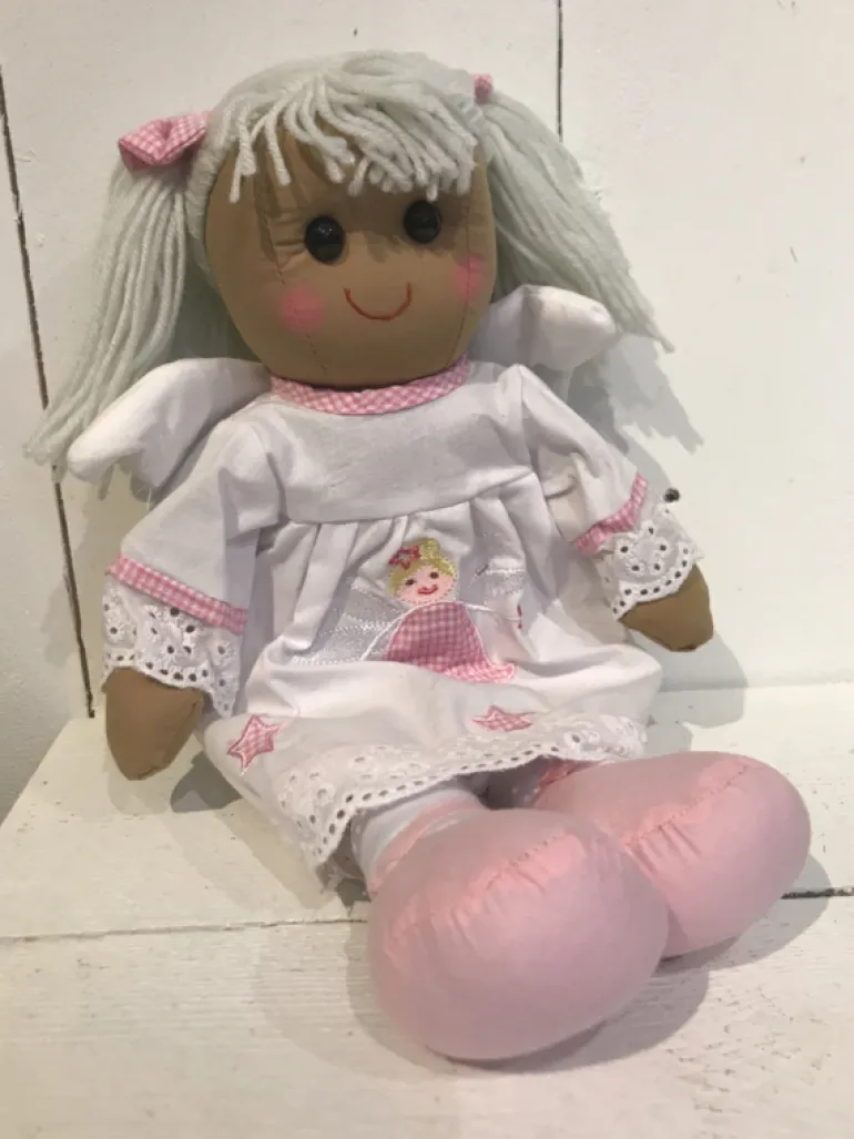 Super lieve stoffen pop met prachtige kleertjes aan voorzien van een geborduurde engel en sterretjes gecombineerd met een roze geruite stof en mooie kant!