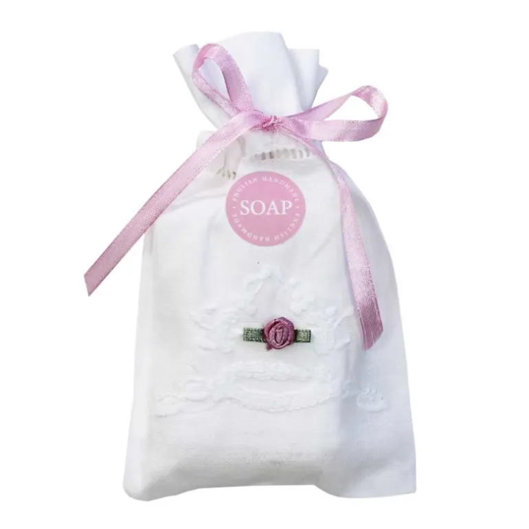 Wit linnen zakje met witte borduursels en roosje en een rozestrikje. In het zakje zit een stuk heerlijk ruikend handmade rozenzeep.