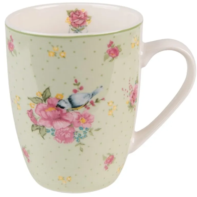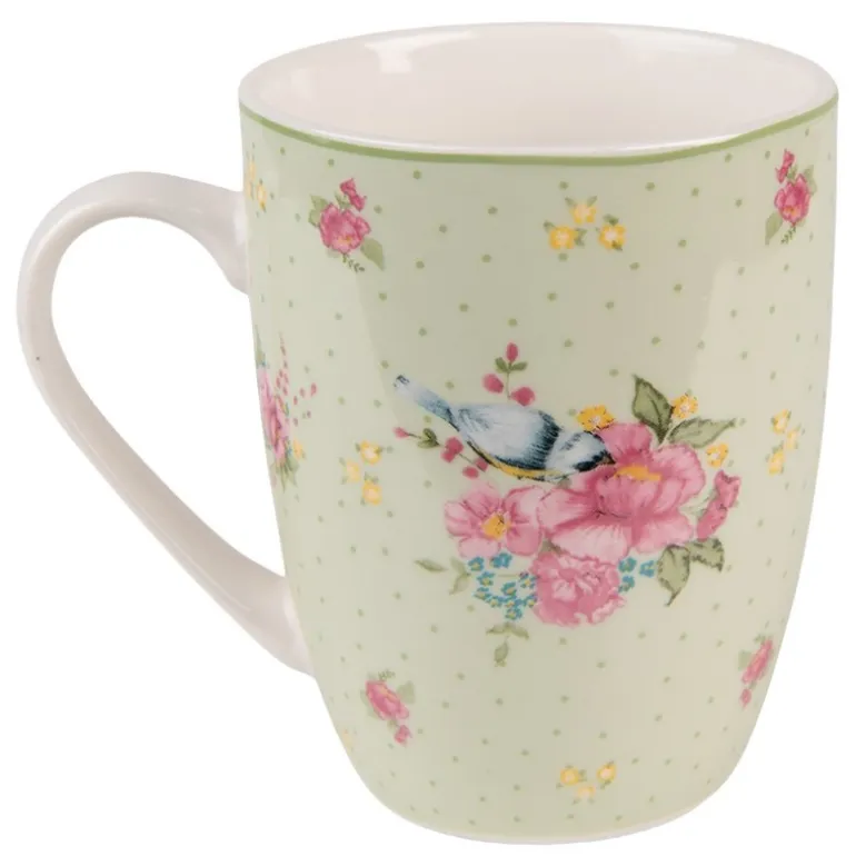 Mooie landelijke groen met beige porseleinen mokmet opdruk van roze bloemen en een schattig vogeltje. Maak het servies compleet door het te combineren met de rest van het servies uit deze serie.