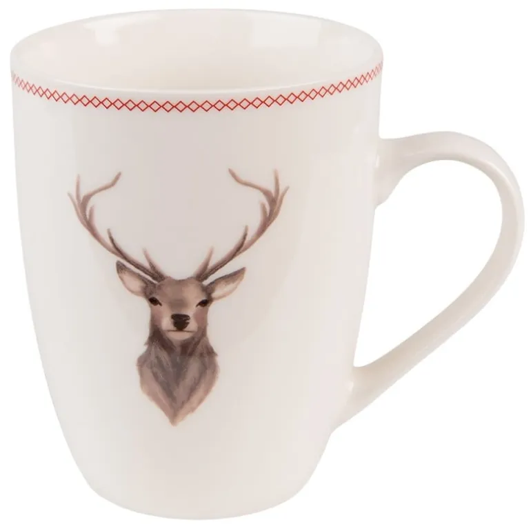 Ook zeergeschikt voor de kerstdagen dit mooie porseleinen servies met een print van een hertenkop met prachtig gewei! De kleur is beige met een bruine hertenkop en als afwerking vind je een klein schuin ruitje in het rood.
