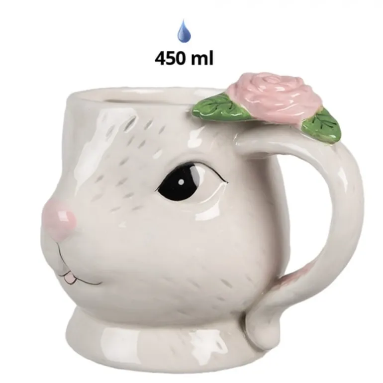 Praxhtige mok in de vorm van een konijn, bovenop het handvat vind je een mooie roos! Door de ruime inhoud van 450 ml is deze naast koffie of thee ook gemakkelijk voor soep te gebruiken!