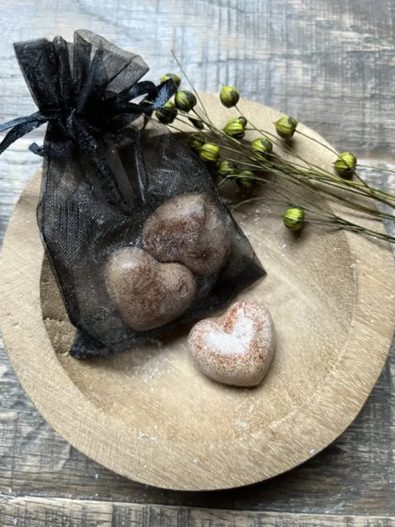 In het organza zakje bevinden zich 3 amberblokjes met de originele heerlijke Amber geur in de vorm van een hartje. Het aroma van amber is houtachtig en oosters!