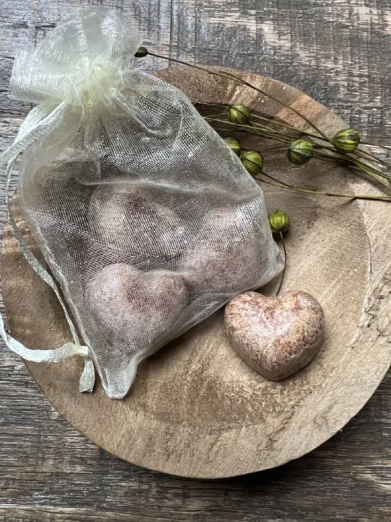 In het organza zakje bevinden zich 3 amberblokjes met de originele heerlijkeAmbergeur in de vorm van een hartje. Het aroma van amber is houtachtig en oosters!
