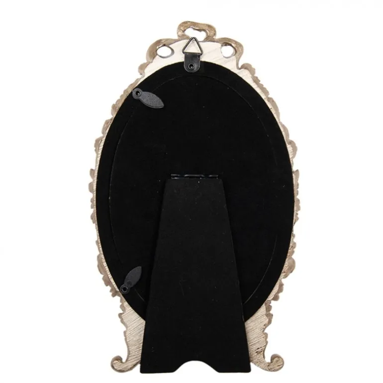 Prachtige sierlijke fotolijst op pootjes en in een ovale vorm. Aan de bovenkant zit een strik met 2 roosjes. Verder vind je op de rand ook bloemen, blaadjes en roosjes.