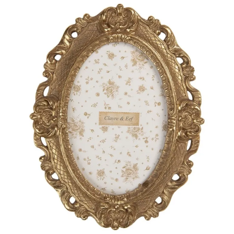 Prachtige sierlijke fotolijst in een ovale vorm.De goudkleurigefotolijst heeft een shabby chic uitstraling met mooie versiersels opde rand en op de rand.