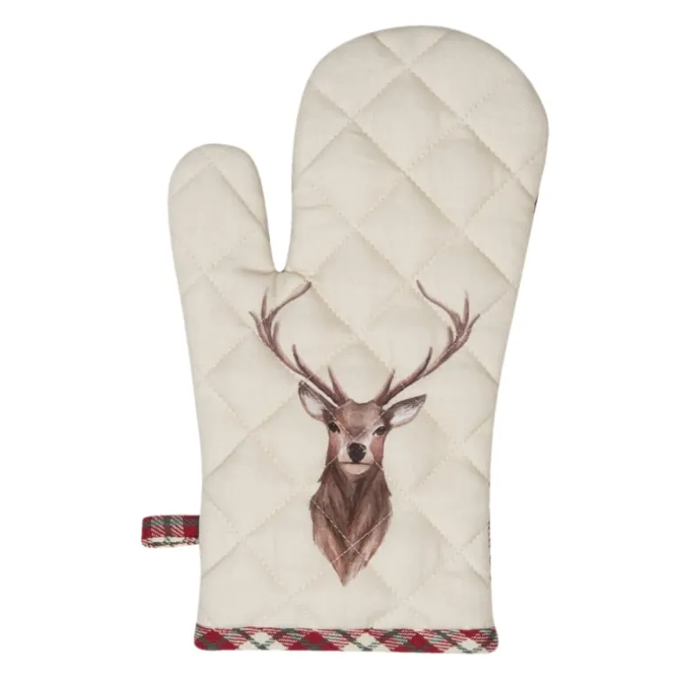 Een effen beige stof met een print van een rendier met gewei en een landelijke geruite stof. Sommige artikelen van deze serie zijn afgewerkt met een mooie band, ook met een print vaneen rendier met gewei.
